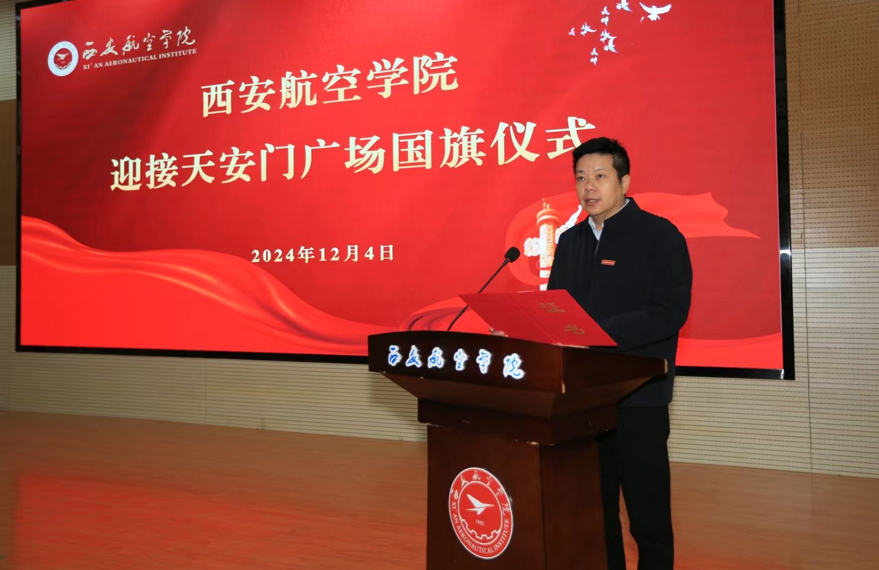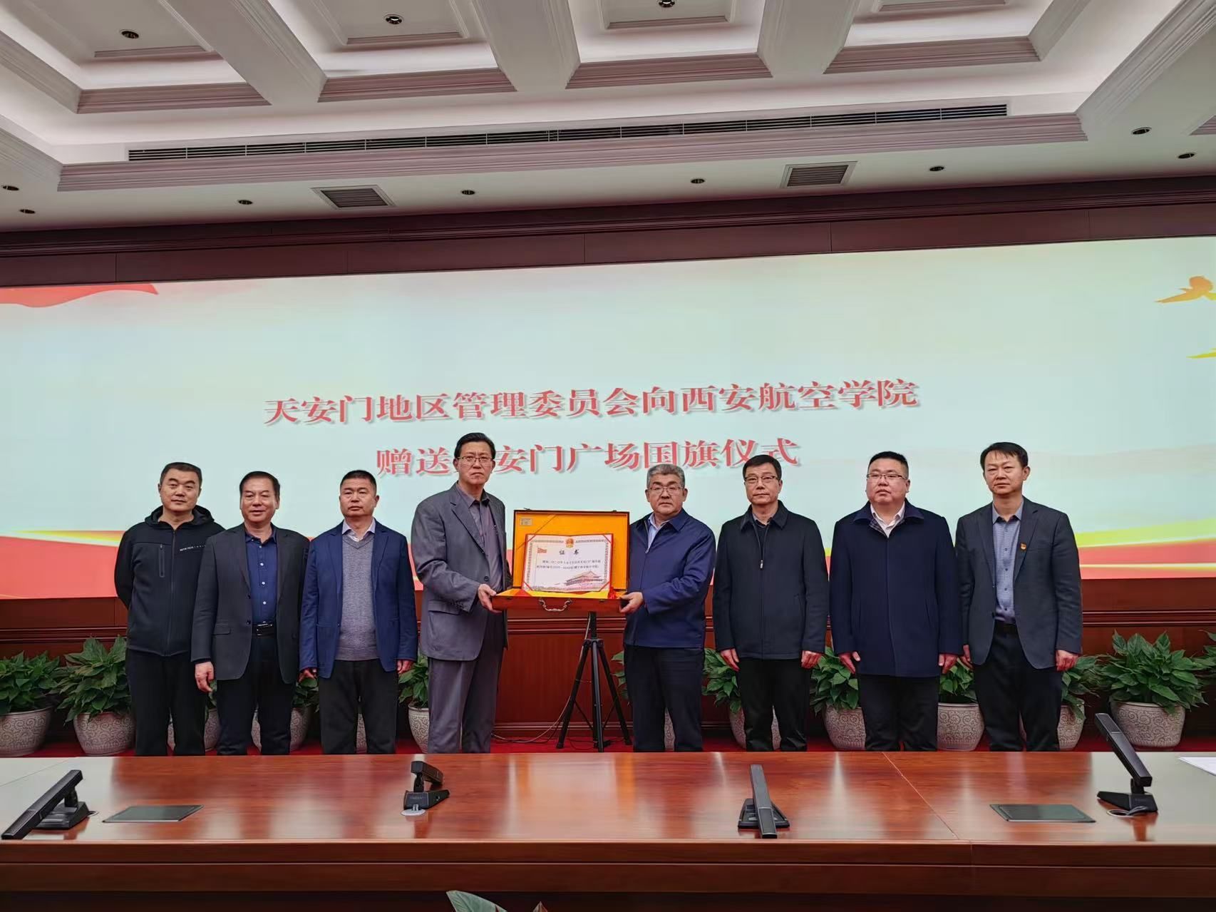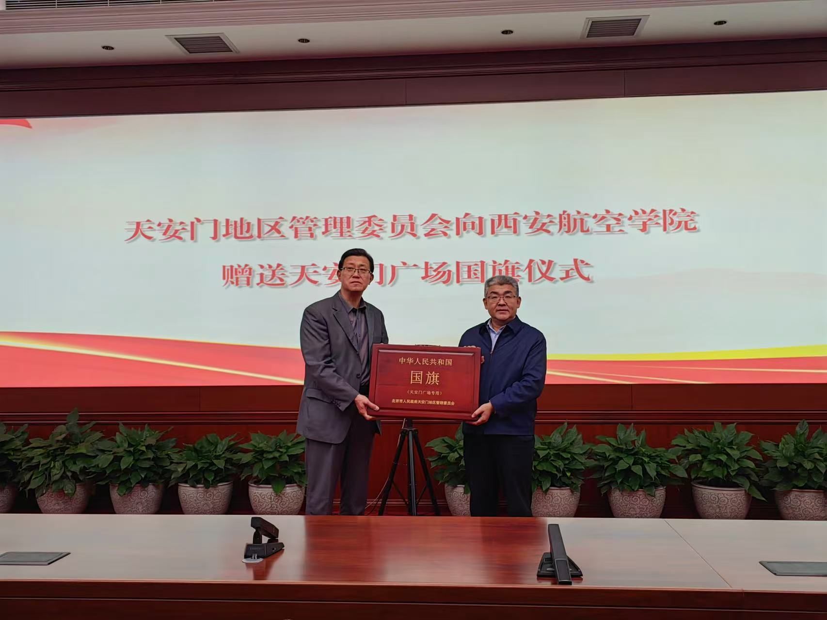 12月1日,北京市人民政府天安门地区管理委员会向西安航空学院赠送天安门广场国旗。赠送仪式在天安门地区运行调度中心举行,天安门地区管委会党组成员、副主任姚辉向西安航空学院赠送国旗,党委书记、校长祁玉龙代表学校接收国旗、签署《国旗赠予协议》,党政办公室主任李永刚、科技处副处长夏瑱超参加赠旗仪式。