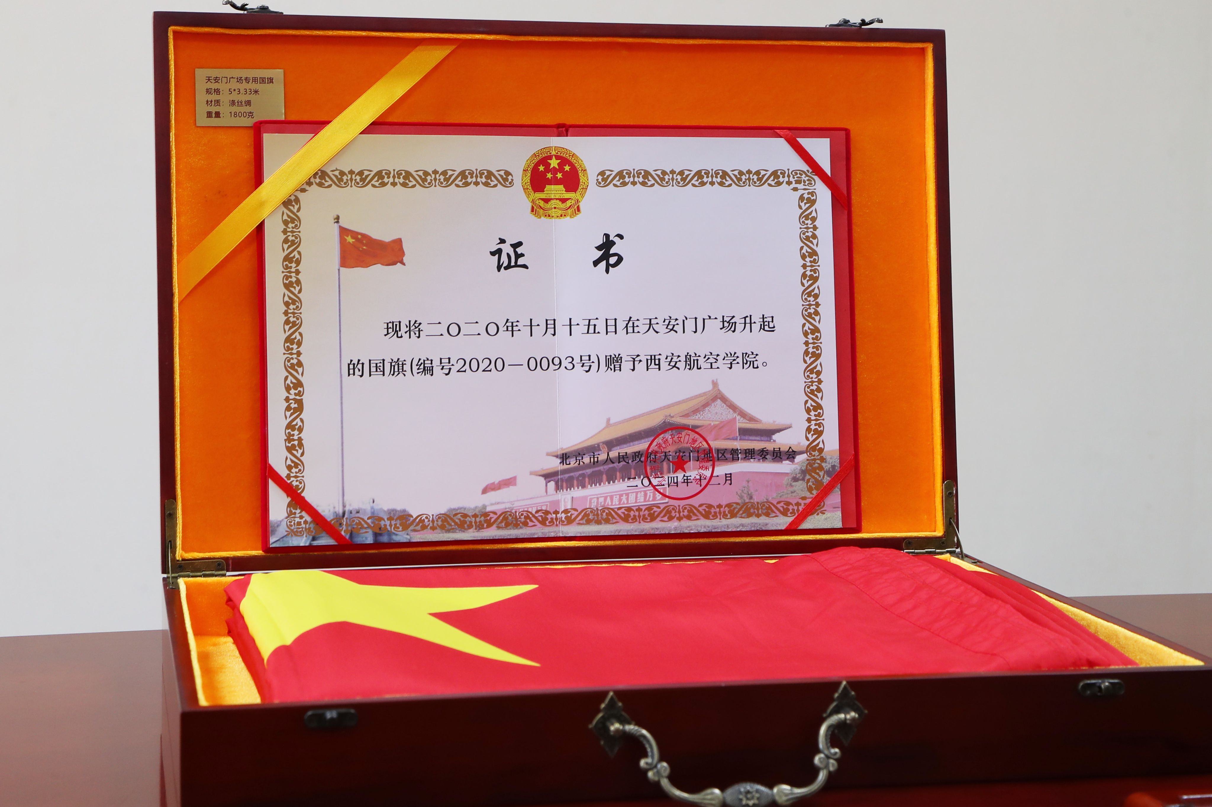 我校申领的国旗编号为2020-0093,国旗长5米、高3.3米,整幅旗面无拼接,5颗五角星采用人工丝网印染工艺,叠放在刻有“中华人民共和国国旗”字样的檀木箱中。此面国旗是天安门地区管委会赠予全国各单位的第279面国旗,曾于2020年10月15日在天安门广场冉冉升起。对西安航空学院来说,这面国旗意义重大:1955年10月15日,经原二机部四局批准,西安航空学院的前身西安航空工业学校破土动工、肇创起步,2020年10月15日是西安航空学院建校65周年校庆日,获赠国旗对学校具有重要的纪念意义和教育意义。