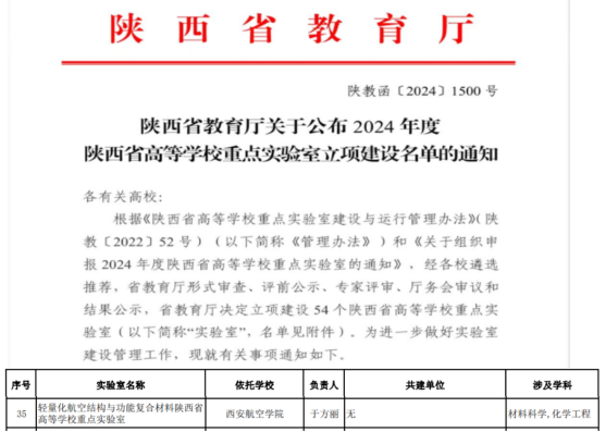 我校材料工程学院与能源与建筑学院联合申报的“轻量化航空结构与功能复合材料”陕西省高等学校重点实验室正式获批。这一成就不仅彰显了我校在航空轻质材料研究领域的坚实步伐,更为材料与化工专业硕士点的建设以及航空材料学科的蓬勃发展提供了强大助力。