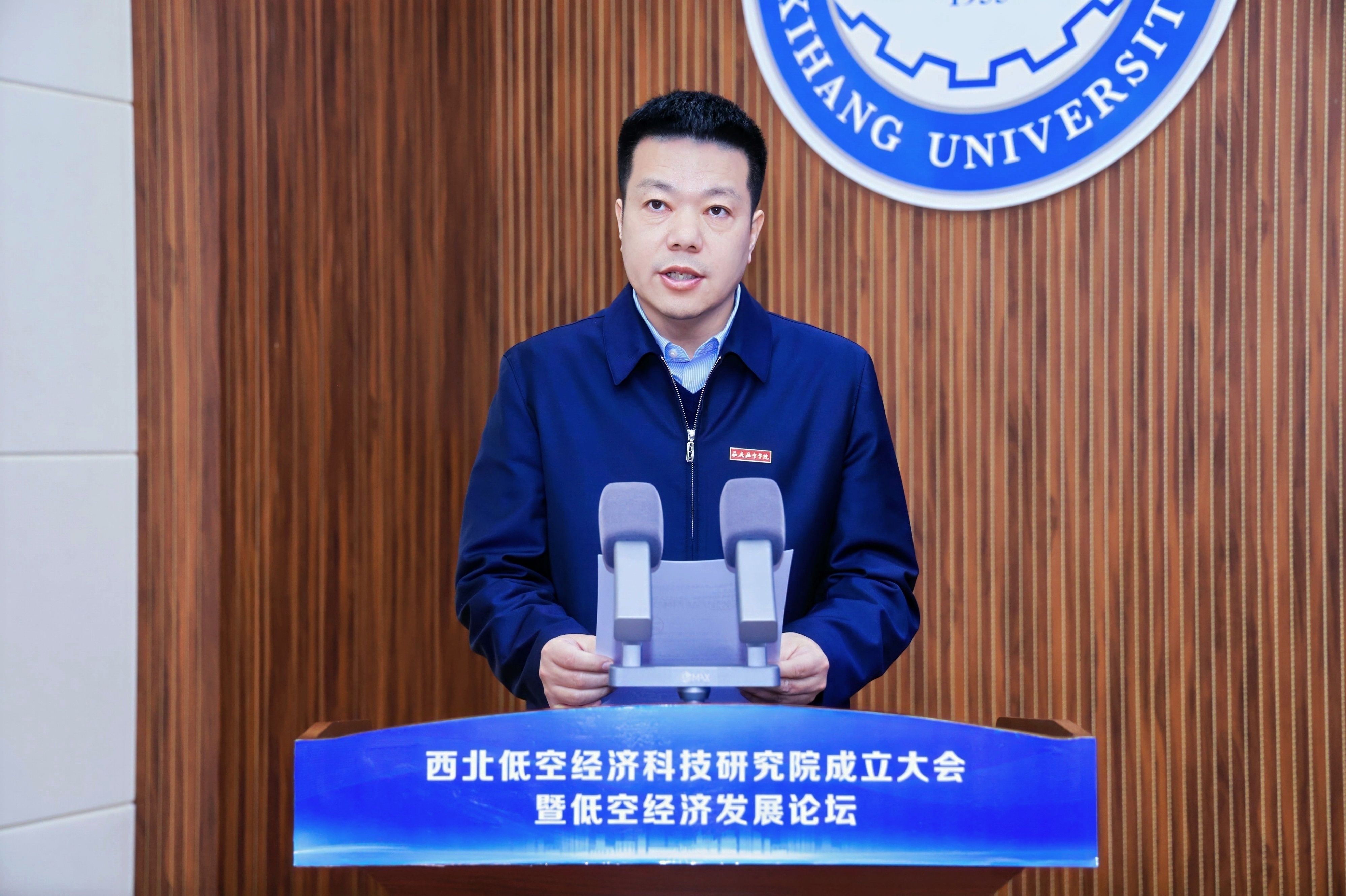 校长蒲永平首先代表学校对与会嘉宾表示热烈欢迎,同时感谢各级部门领导、兄弟院校及社会各界长期以来对学校发展的关怀和支持。他指出,低空经济作为未来经济发展的新引擎,具有巨大的潜力和广阔的发展前景,研究院的成立将为推动低空经济的科技创新和产业发展提供重要支撑。